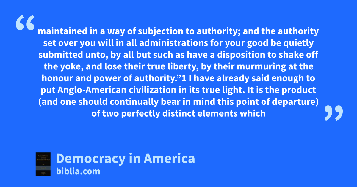 maintained in a way of subjection to authority; and the authority set over you will in all administrations for your good be quietly submitted unto, by all but such as have a disposition to shake off the yoke, and lose their true liberty, by their murmuring at the honour and power of authority.”1 I have already said enough to put Anglo-American civilization in its true light. It is the product (and one should continually bear in mind this point of departure) of two perfectly distinct elements which