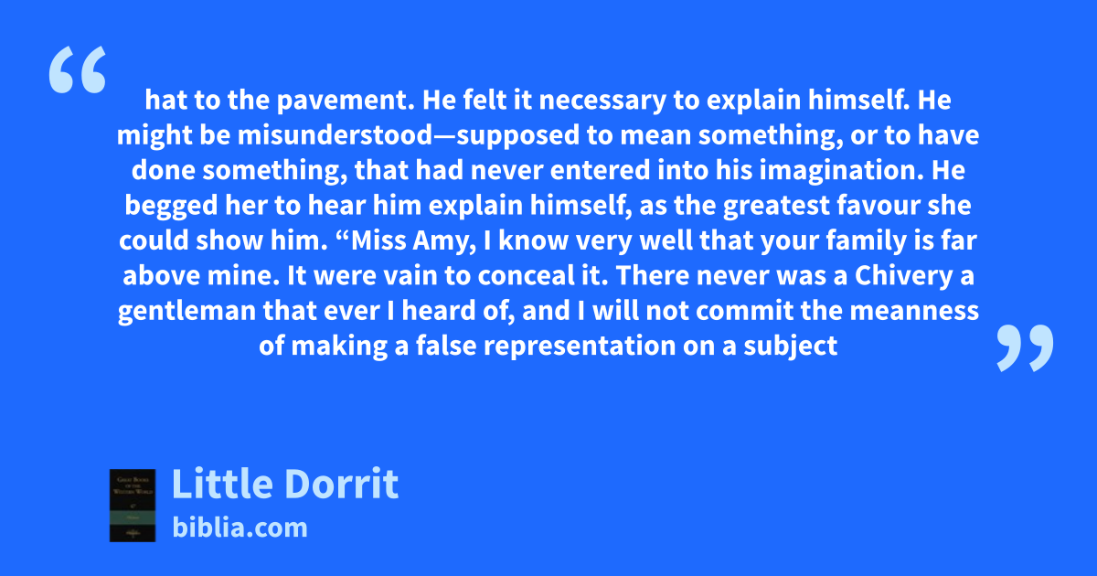 hat to the pavement. He felt it necessary to explain himself. He might be misunderstood—supposed to mean something, or to have done something, that had never entered into his imagination. He begged her to hear him explain himself, as the greatest favour she could show him. “Miss Amy, I know very well that your family is far above mine. It were vain to conceal it. There never was a Chivery a gentleman that ever I heard of, and I will not commit the meanness of making a false representation on a subject