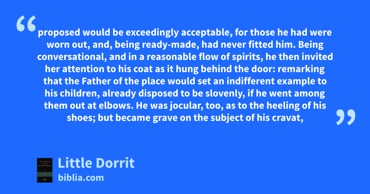 proposed would be exceedingly acceptable, for those he had were worn out, and, being ready-made, had never fitted him. Being conversational, and in a reasonable flow of spirits, he then invited her attention to his coat as it hung behind the door: remarking that the Father of the place would set an indifferent example to his children, already disposed to be slovenly, if he went among them out at elbows. He was jocular, too, as to the heeling of his shoes; but became grave on the subject of his cravat,