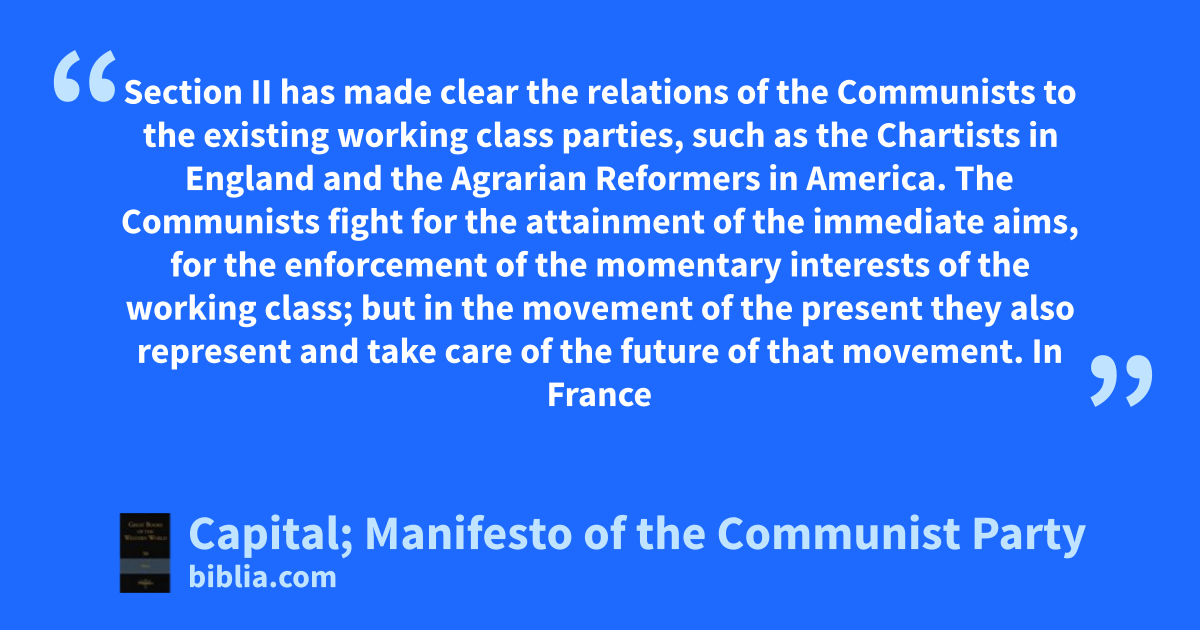 Section II has made clear the relations of the Communists to the existing working class parties, such as the Chartists in England and the Agrarian Reformers in America. The Communists fight for the attainment of the immediate aims, for the enforcement of the momentary interests of the working class; but in the movement of the present they also represent and take care of the future of that movement. In France