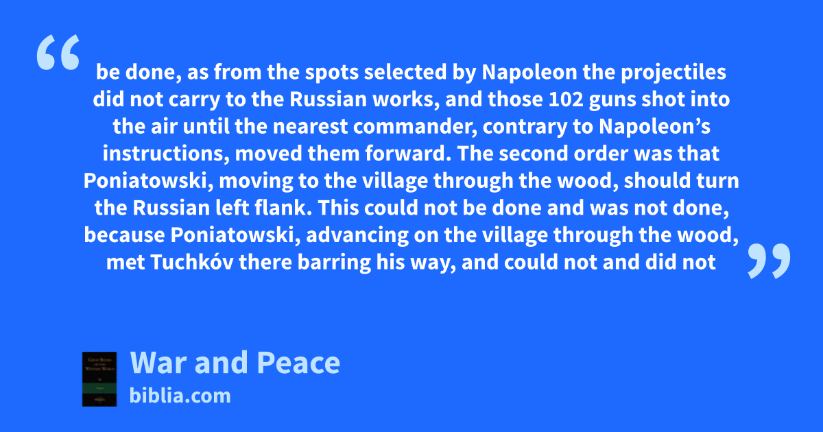 be done, as from the spots selected by Napoleon the projectiles did not carry to the Russian works, and those 102 guns shot into the air until the nearest commander, contrary to Napoleon’s instructions, moved them forward. The second order was that Poniatowski, moving to the village through the wood, should turn the Russian left flank. This could not be done and was not done, because Poniatowski, advancing on the village through the wood, met Tuchkóv there barring his way, and could not and did not