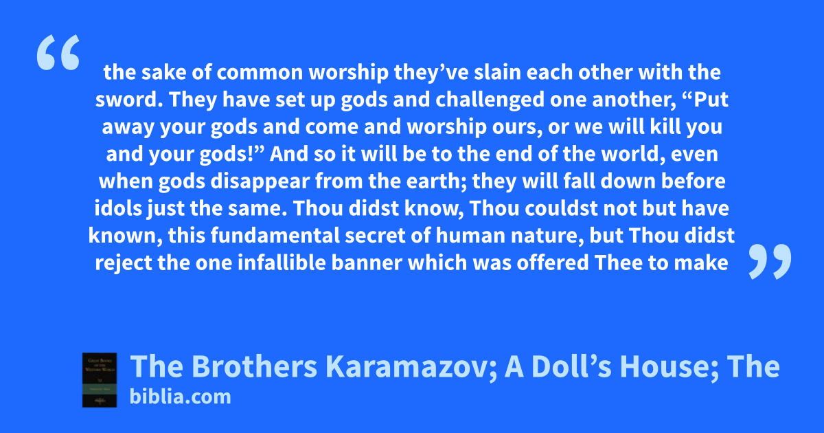 the sake of common worship they’ve slain each other with the sword. They have set up gods and challenged one another, “Put away your gods and come and worship ours, or we will kill you and your gods!” And so it will be to the end of the world, even when gods disappear from the earth; they will fall down before idols just the same. Thou didst know, Thou couldst not but have known, this fundamental secret of human nature, but Thou didst reject the one infallible banner which was offered Thee to make