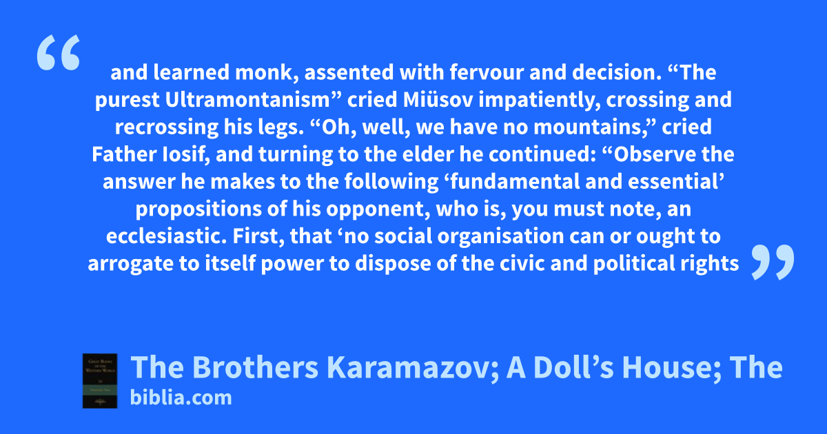 and learned monk, assented with fervour and decision. “The purest Ultramontanism” cried Miüsov impatiently, crossing and recrossing his legs. “Oh, well, we have no mountains,” cried Father Iosif, and turning to the elder he continued: “Observe the answer he makes to the following ‘fundamental and essential’ propositions of his opponent, who is, you must note, an ecclesiastic. First, that ‘no social organisation can or ought to arrogate to itself power to dispose of the civic and political rights