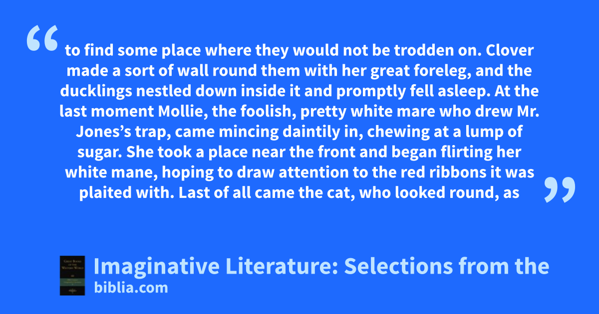 to find some place where they would not be trodden on. Clover made a sort of wall round them with her great foreleg, and the ducklings nestled down inside it and promptly fell asleep. At the last moment Mollie, the foolish, pretty white mare who drew Mr. Jones’s trap, came mincing daintily in, chewing at a lump of sugar. She took a place near the front and began flirting her white mane, hoping to draw attention to the red ribbons it was plaited with. Last of all came the cat, who looked round, as