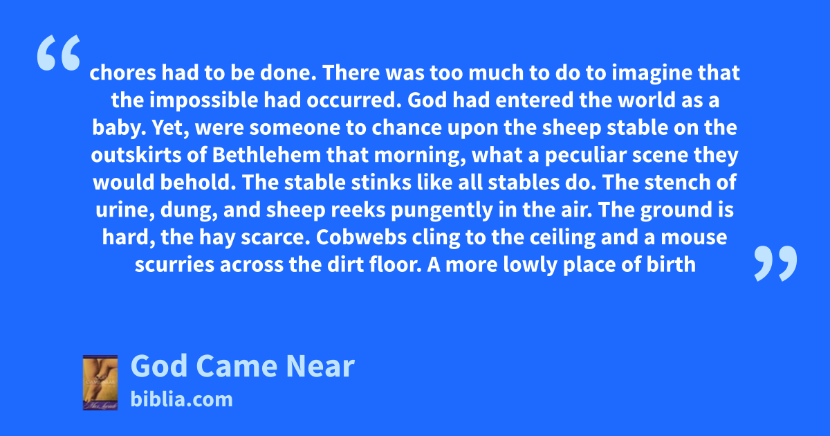 chores had to be done. There was too much to do to imagine that the impossible had occurred. God had entered the world as a baby. Yet, were someone to chance upon the sheep stable on the outskirts of Bethlehem that morning, what a peculiar scene they would behold. The stable stinks like all stables do. The stench of urine, dung, and sheep reeks pungently in the air. The ground is hard, the hay scarce. Cobwebs cling to the ceiling and a mouse scurries across the dirt floor. A more lowly place of birth