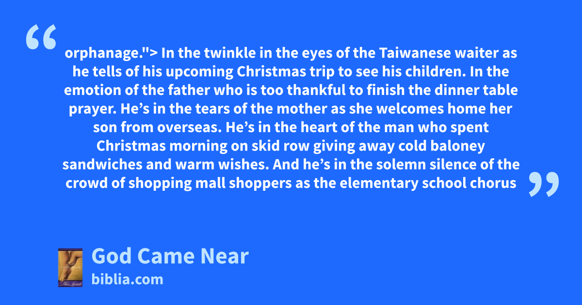 orphanage."> In the twinkle in the eyes of the Taiwanese waiter as he tells of his upcoming Christmas trip to see his children. In the emotion of the father who is too thankful to finish the dinner table prayer. He’s in the tears of the mother as she welcomes home her son from overseas. He’s in the heart of the man who spent Christmas morning on skid row giving away cold baloney sandwiches and warm wishes. And he’s in the solemn silence of the crowd of shopping mall shoppers as the elementary school chorus
