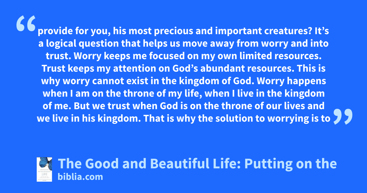 provide for you, his most precious and important creatures? It’s a logical question that helps us move away from worry and into trust. Worry keeps me focused on my own limited resources. Trust keeps my attention on God’s abundant resources. This is why worry cannot exist in the kingdom of God. Worry happens when I am on the throne of my life, when I live in the kingdom of me. But we trust when God is on the throne of our lives and we live in his kingdom. That is why the solution to worrying is to
