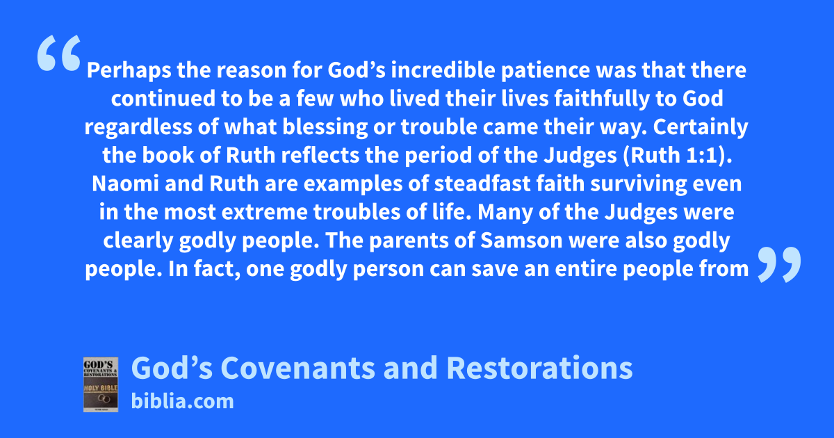 Perhaps the reason for God’s incredible patience was that there continued to be a few who lived their lives faithfully to God regardless of what blessing or trouble came their way. Certainly the book of Ruth reflects the period of the Judges (Ruth 1:1). Naomi and Ruth are examples of steadfast faith surviving even in the most extreme troubles of life. Many of the Judges were clearly godly people. The parents of Samson were also godly people. In fact, one godly person can save an entire people from