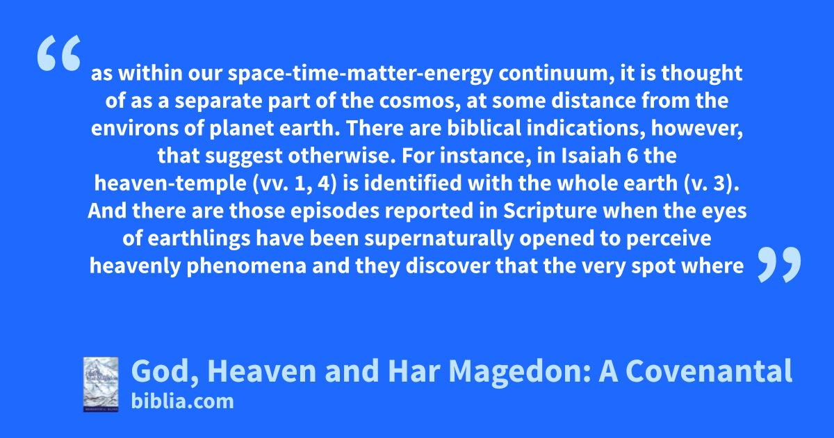 as within our space-time-matter-energy continuum, it is thought of as a separate part of the cosmos, at some distance from the environs of planet earth. There are biblical indications, however, that suggest otherwise. For instance, in Isaiah 6 the heaven-temple (vv. 1, 4) is identified with the whole earth (v. 3). And there are those episodes reported in Scripture when the eyes of earthlings have been supernaturally opened to perceive heavenly phenomena and they discover that the very spot where