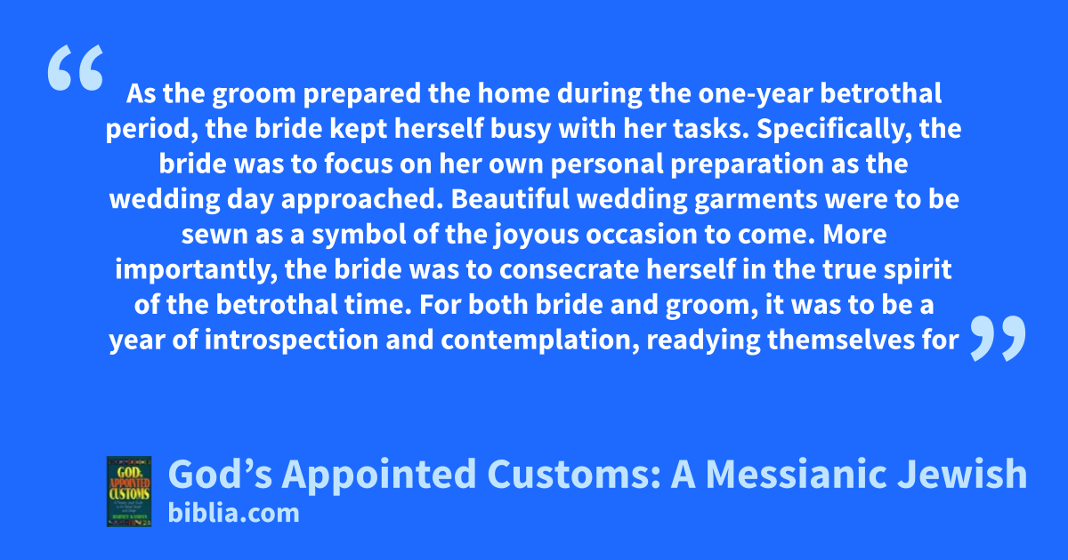 As the groom prepared the home during the one-year betrothal period, the bride kept herself busy with her tasks. Specifically, the bride was to focus on her own personal preparation as the wedding day approached. Beautiful wedding garments were to be sewn as a symbol of the joyous occasion to come. More importantly, the bride was to consecrate herself in the true spirit of the betrothal time. For both bride and groom, it was to be a year of introspection and contemplation, readying themselves for