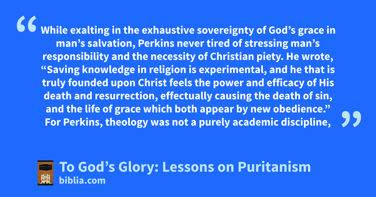 While exalting in the exhaustive sovereignty of God’s grace in man’s salvation, Perkins never tired of stressing man’s responsibility and the necessity of Christian piety. He wrote, “Saving knowledge in religion is experimental, and he that is truly founded upon Christ feels the power and efficacy of His death and resurrection, effectually causing the death of sin, and the life of grace which both appear by new obedience.” For Perkins, theology was not a purely academic discipline,