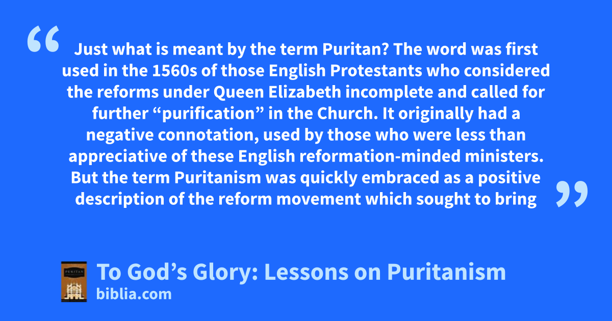 Just what is meant by the term Puritan? The word was first used in the 1560s of those English Protestants who considered the reforms under Queen Elizabeth incomplete and called for further “purification” in the Church. It originally had a negative connotation, used by those who were less than appreciative of these English reformation-minded ministers. But the term Puritanism was quickly embraced as a positive description of the reform movement which sought to bring