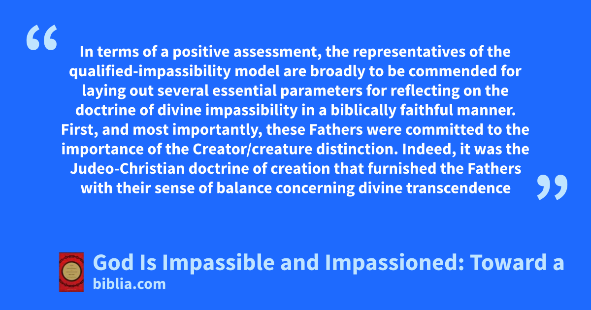 In terms of a positive assessment, the representatives of the qualified-impassibility model are broadly to be commended for laying out several essential parameters for reflecting on the doctrine of divine impassibility in a biblically faithful manner. First, and most importantly, these Fathers were committed to the importance of the Creator/creature distinction. Indeed, it was the Judeo-Christian doctrine of creation that furnished the Fathers with their sense of balance concerning divine transcendence