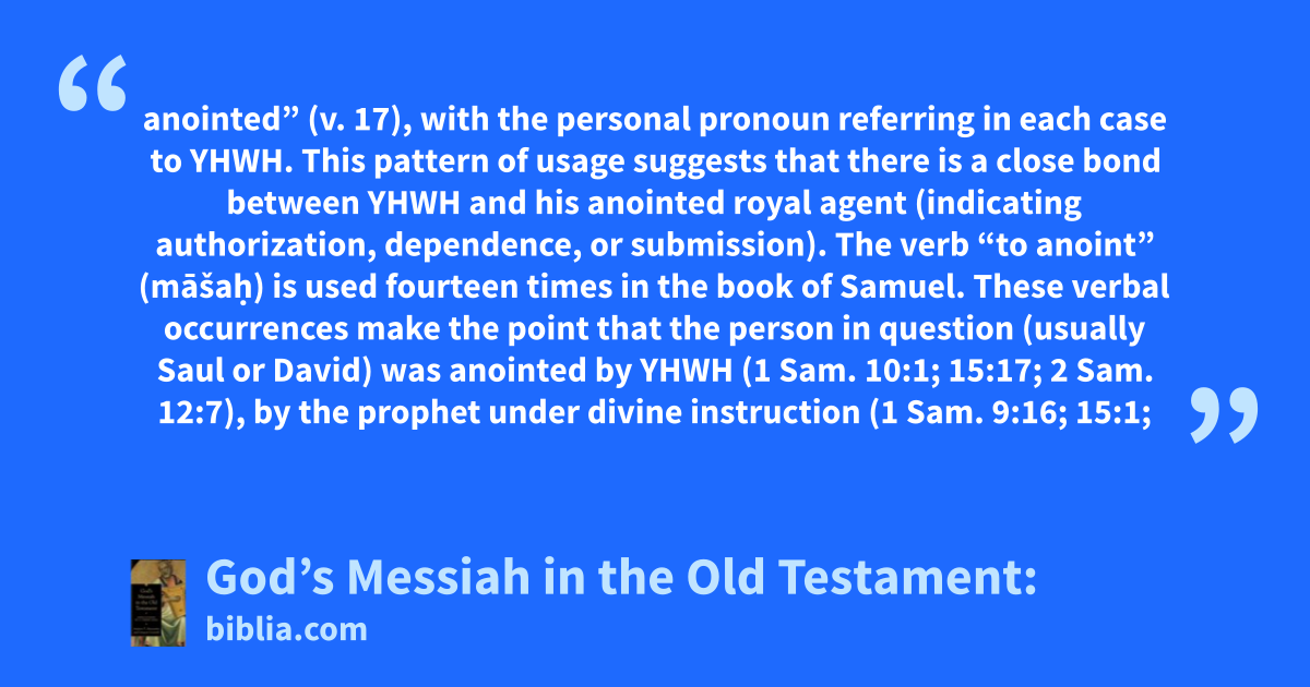 anointed” (v. 17), with the personal pronoun referring in each case to YHWH. This pattern of usage suggests that there is a close bond between YHWH and his anointed royal agent (indicating authorization, dependence, or submission). The verb “to anoint” (māšaḥ) is used fourteen times in the book of Samuel. These verbal occurrences make the point that the person in question (usually Saul or David) was anointed by YHWH (1 Sam. 10:1; 15:17; 2 Sam. 12:7), by the prophet under divine instruction (1 Sam. 9:16; 15:1;