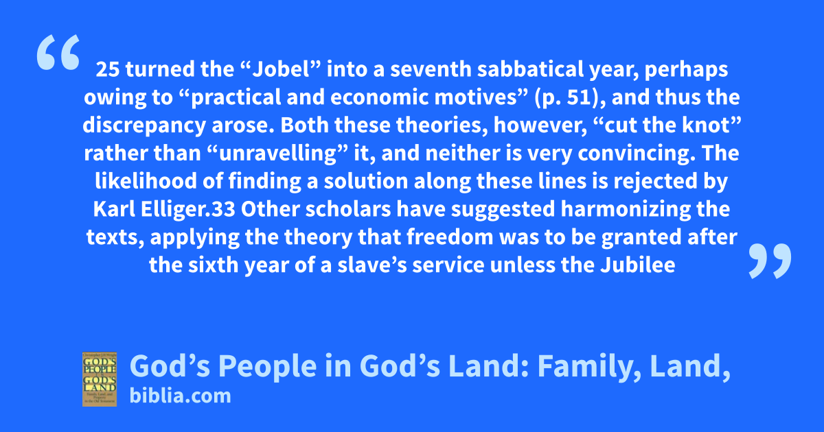 25 turned the “Jobel” into a seventh sabbatical year, perhaps owing to “practical and economic motives” (p. 51), and thus the discrepancy arose. Both these theories, however, “cut the knot” rather than “unravelling” it, and neither is very convincing. The likelihood of finding a solution along these lines is rejected by Karl Elliger.33 Other scholars have suggested harmonizing the texts, applying the theory that freedom was to be granted after the sixth year of a slave’s service unless the Jubilee