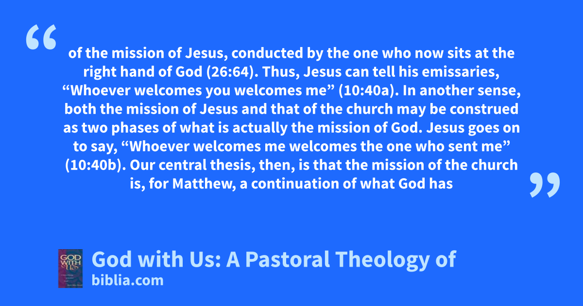 of the mission of Jesus, conducted by the one who now sits at the right hand of God (26:64). Thus, Jesus can tell his emissaries, “Whoever welcomes you welcomes me” (10:40a). In another sense, both the mission of Jesus and that of the church may be construed as two phases of what is actually the mission of God. Jesus goes on to say, “Whoever welcomes me welcomes the one who sent me” (10:40b). Our central thesis, then, is that the mission of the church is, for Matthew, a continuation of what God has