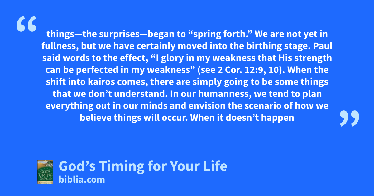 things—the surprises—began to “spring forth.” We are not yet in fullness, but we have certainly moved into the birthing stage. Paul said words to the effect, “I glory in my weakness that His strength can be perfected in my weakness” (see 2 Cor. 12:9, 10). When the shift into kairos comes, there are simply going to be some things that we don’t understand. In our humanness, we tend to plan everything out in our minds and envision the scenario of how we believe things will occur. When it doesn’t happen