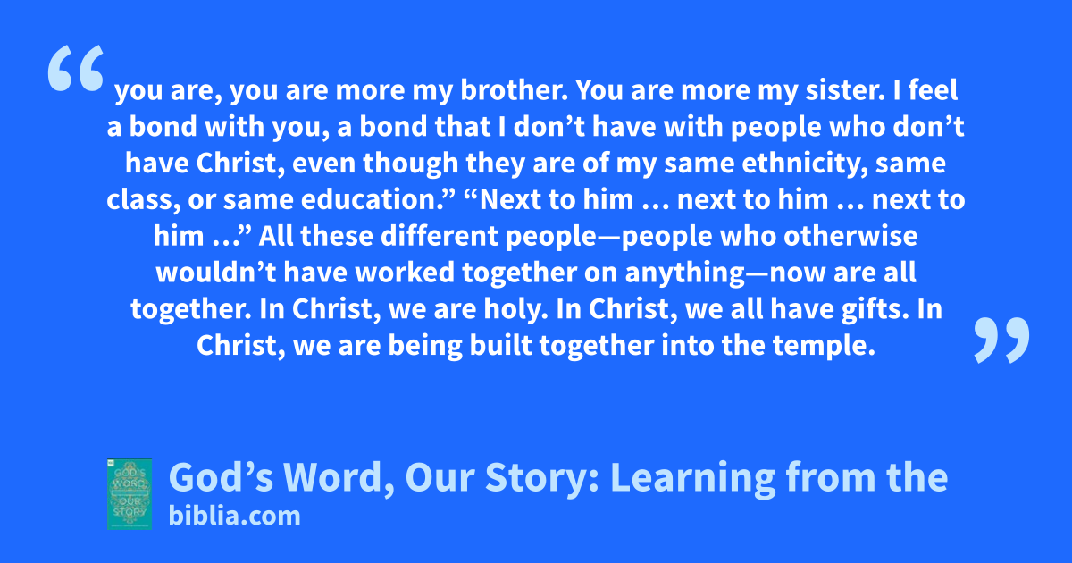 you are, you are more my brother. You are more my sister. I feel a bond with you, a bond that I don’t have with people who don’t have Christ, even though they are of my same ethnicity, same class, or same education.” “Next to him … next to him … next to him …” All these different people—people who otherwise wouldn’t have worked together on anything—now are all together. In Christ, we are holy. In Christ, we all have gifts. In Christ, we are being built together into the temple.