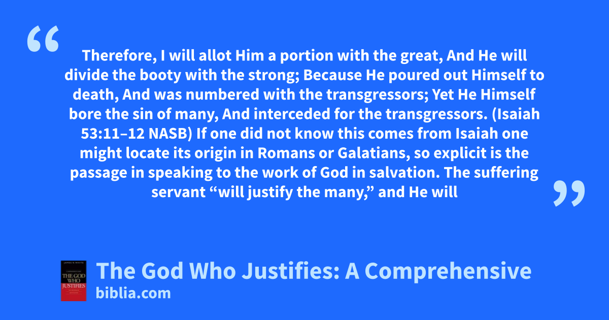 Therefore, I will allot Him a portion with the great, And He will divide the booty with the strong; Because He poured out Himself to death, And was numbered with the transgressors; Yet He Himself bore the sin of many, And interceded for the transgressors. (Isaiah 53:11–12 NASB) If one did not know this comes from Isaiah one might locate its origin in Romans or Galatians, so explicit is the passage in speaking to the work of God in salvation. The suffering servant “will justify the many,” and He will