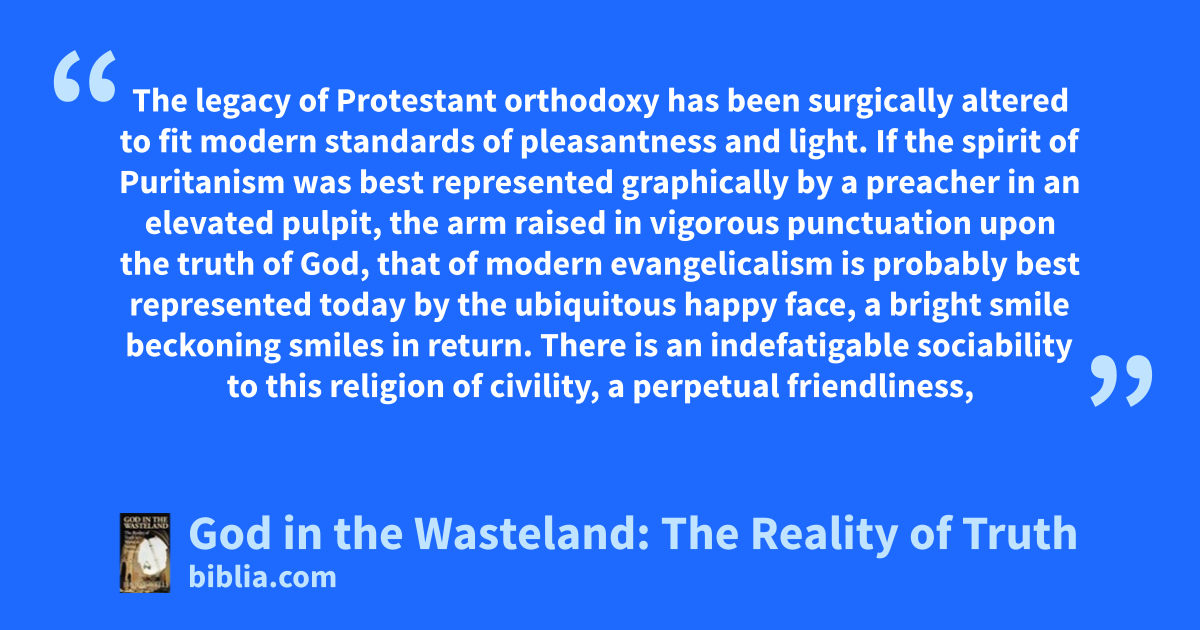The legacy of Protestant orthodoxy has been surgically altered to fit modern standards of pleasantness and light. If the spirit of Puritanism was best represented graphically by a preacher in an elevated pulpit, the arm raised in vigorous punctuation upon the truth of God, that of modern evangelicalism is probably best represented today by the ubiquitous happy face, a bright smile beckoning smiles in return. There is an indefatigable sociability to this religion of civility, a perpetual friendliness,