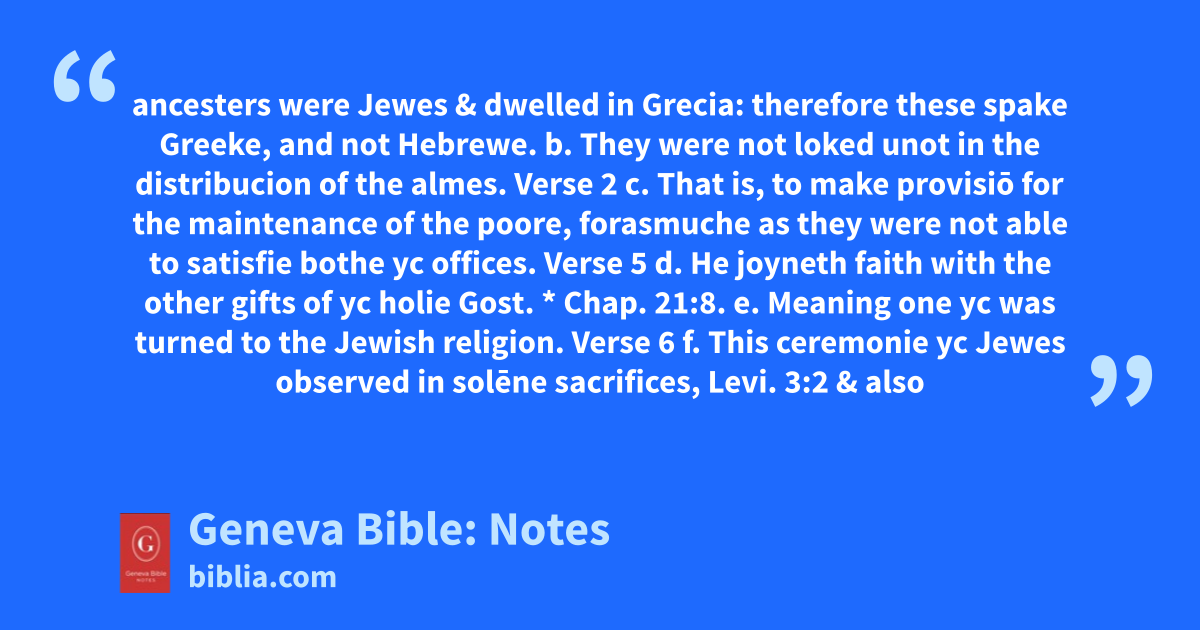 ancesters were Jewes & dwelled in Grecia: therefore these spake Greeke, and not Hebrewe. b. They were not loked unot in the distribucion of the almes. Verse 2 c. That is, to make provisiō for the maintenance of the poore, forasmuche as they were not able to satisfie bothe yc offices. Verse 5 d. He joyneth faith with the other gifts of yc holie Gost. * Chap. 21:8. e. Meaning one yc was turned to the Jewish religion. Verse 6 f. This ceremonie yc Jewes observed in solēne sacrifices, Levi. 3:2 & also