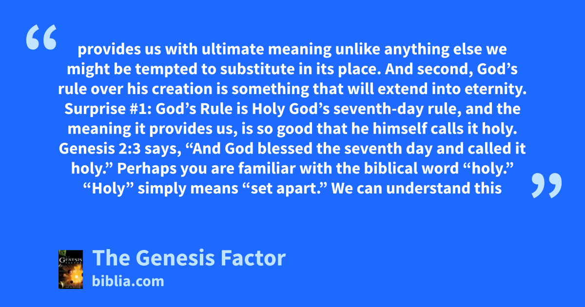 provides us with ultimate meaning unlike anything else we might be tempted to substitute in its place. And second, God’s rule over his creation is something that will extend into eternity. Surprise #1: God’s Rule is Holy God’s seventh-day rule, and the meaning it provides us, is so good that he himself calls it holy. Genesis 2:3 says, “And God blessed the seventh day and called it holy.” Perhaps you are familiar with the biblical word “holy.” “Holy” simply means “set apart.” We can understand this