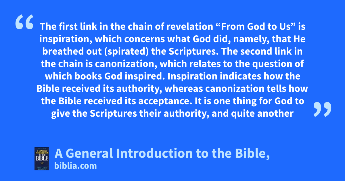 The first link in the chain of revelation “From God to Us” is inspiration, which concerns what God did, namely, that He breathed out (spirated) the Scriptures. The second link in the chain is canonization, which relates to the question of which books God inspired. Inspiration indicates how the Bible received its authority, whereas canonization tells how the Bible received its acceptance. It is one thing for God to give the Scriptures their authority, and quite another