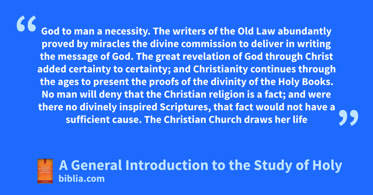 God to man a necessity. The writers of the Old Law abundantly proved by miracles the divine commission to deliver in writing the message of God. The great revelation of God through Christ added certainty to certainty; and Christianity continues through the ages to present the proofs of the divinity of the Holy Books. No man will deny that the Christian religion is a fact; and were there no divinely inspired Scriptures, that fact would not have a sufficient cause. The Christian Church draws her life