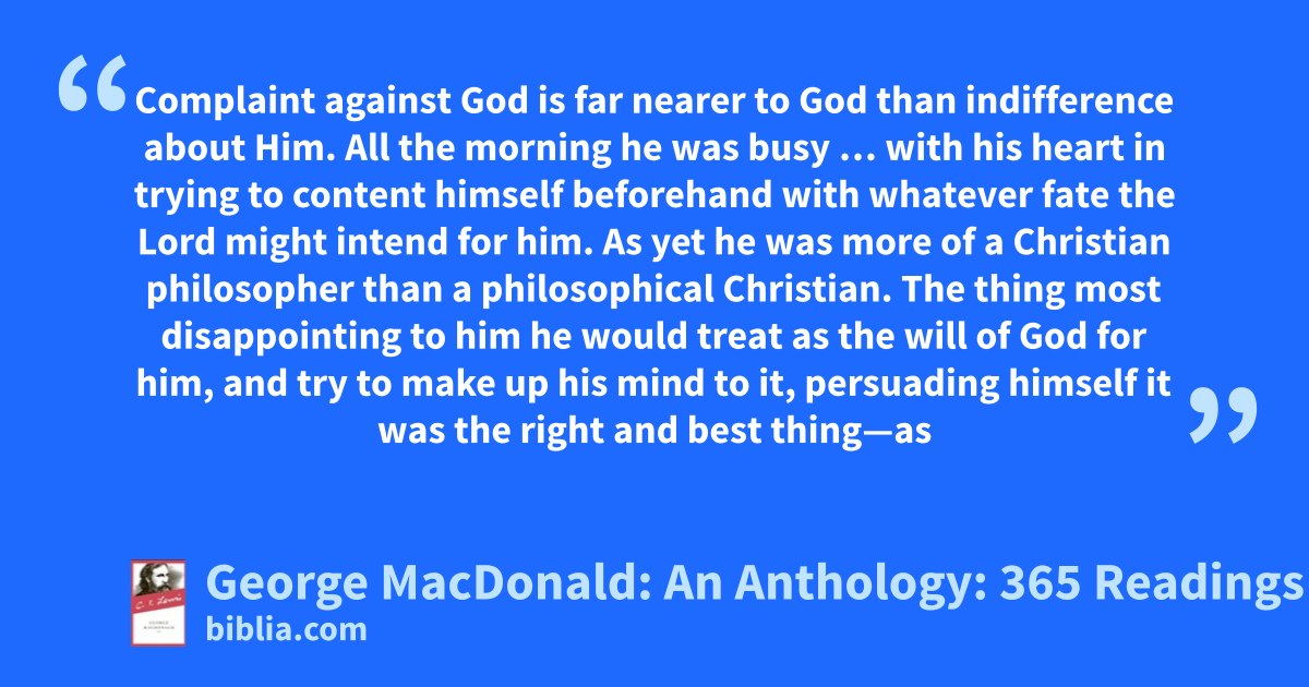 Complaint against God is far nearer to God than indifference about Him. All the morning he was busy … with his heart in trying to content himself beforehand with whatever fate the Lord might intend for him. As yet he was more of a Christian philosopher than a philosophical Christian. The thing most disappointing to him he would treat as the will of God for him, and try to make up his mind to it, persuading himself it was the right and best thing—as