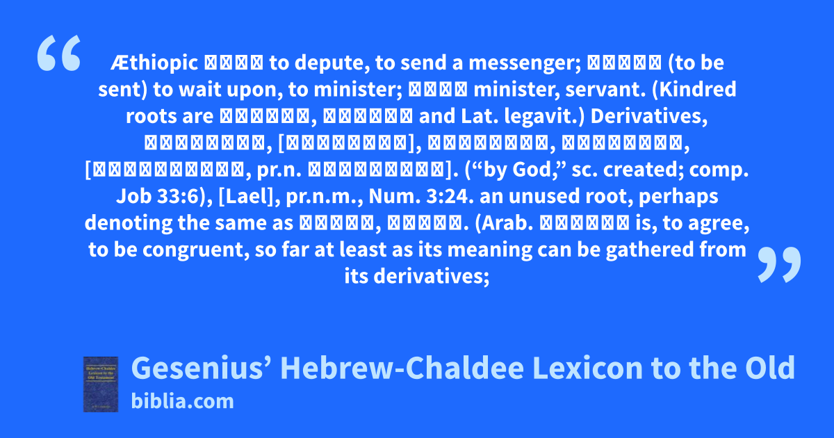 Æthiopic ለአከ፡ to depute, to send a messenger; ተልእከ፡ (to be sent) to wait upon, to minister; ለእክ፡ minister, servant. (Kindred roots are הָלַךְ, יָלַךְ and Lat. legavit.) Derivatives, מַלְאָךְ, [מַלְאָךְ], מְלָאכָה, מְלֶאכֶת, [מַלְאָכוּת, pr.n. מַלְאָכִי]. (“by God,” sc. created; comp. Job 33:6), [Lael], pr.n.m., Num. 3:24. an unused root, perhaps denoting the same as אָמַם, עָמַם. (Arab. لَأَمَ is, to agree, to be congruent, so far at least as its meaning can be gathered from its derivatives;