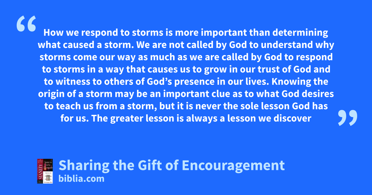 How we respond to storms is more important than determining what caused a storm. We are not called by God to understand why storms come our way as much as we are called by God to respond to storms in a way that causes us to grow in our trust of God and to witness to others of God’s presence in our lives. Knowing the origin of a storm may be an important clue as to what God desires to teach us from a storm, but it is never the sole lesson God has for us. The greater lesson is always a lesson we discover