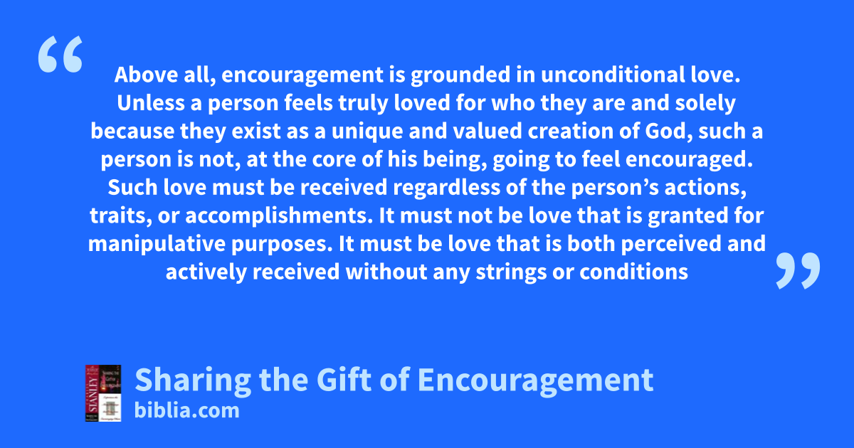 Above all, encouragement is grounded in unconditional love. Unless a person feels truly loved for who they are and solely because they exist as a unique and valued creation of God, such a person is not, at the core of his being, going to feel encouraged. Such love must be received regardless of the person’s actions, traits, or accomplishments. It must not be love that is granted for manipulative purposes. It must be love that is both perceived and actively received without any strings or conditions
