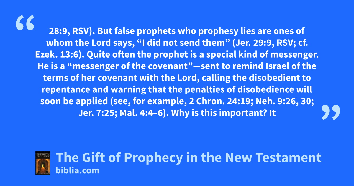 28:9, RSV). But false prophets who prophesy lies are ones of whom the Lord says, “I did not send them” (Jer. 29:9, RSV; cf. Ezek. 13:6). Quite often the prophet is a special kind of messenger. He is a “messenger of the covenant”—sent to remind Israel of the terms of her covenant with the Lord, calling the disobedient to repentance and warning that the penalties of disobedience will soon be applied (see, for example, 2 Chron. 24:19; Neh. 9:26, 30; Jer. 7:25; Mal. 4:4–6). Why is this important? It