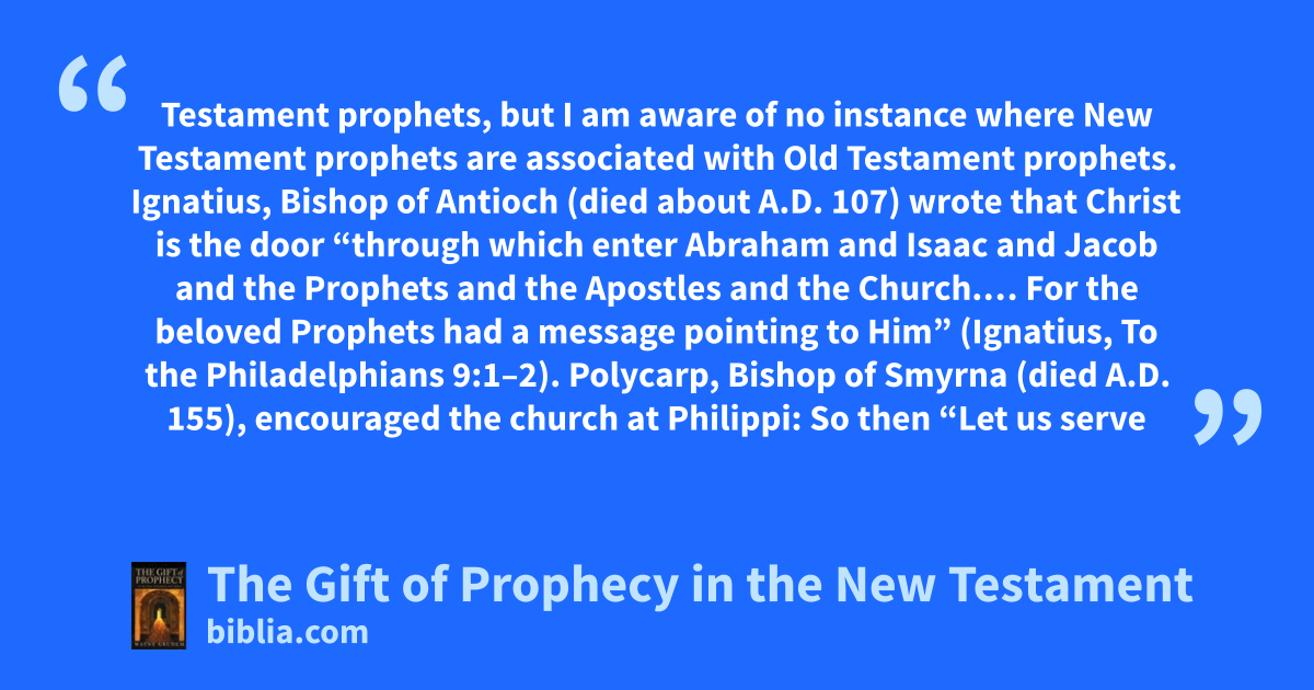 Testament prophets, but I am aware of no instance where New Testament prophets are associated with Old Testament prophets. Ignatius, Bishop of Antioch (died about A.D. 107) wrote that Christ is the door “through which enter Abraham and Isaac and Jacob and the Prophets and the Apostles and the Church.… For the beloved Prophets had a message pointing to Him” (Ignatius, To the Philadelphians 9:1–2). Polycarp, Bishop of Smyrna (died A.D. 155), encouraged the church at Philippi: So then “Let us serve