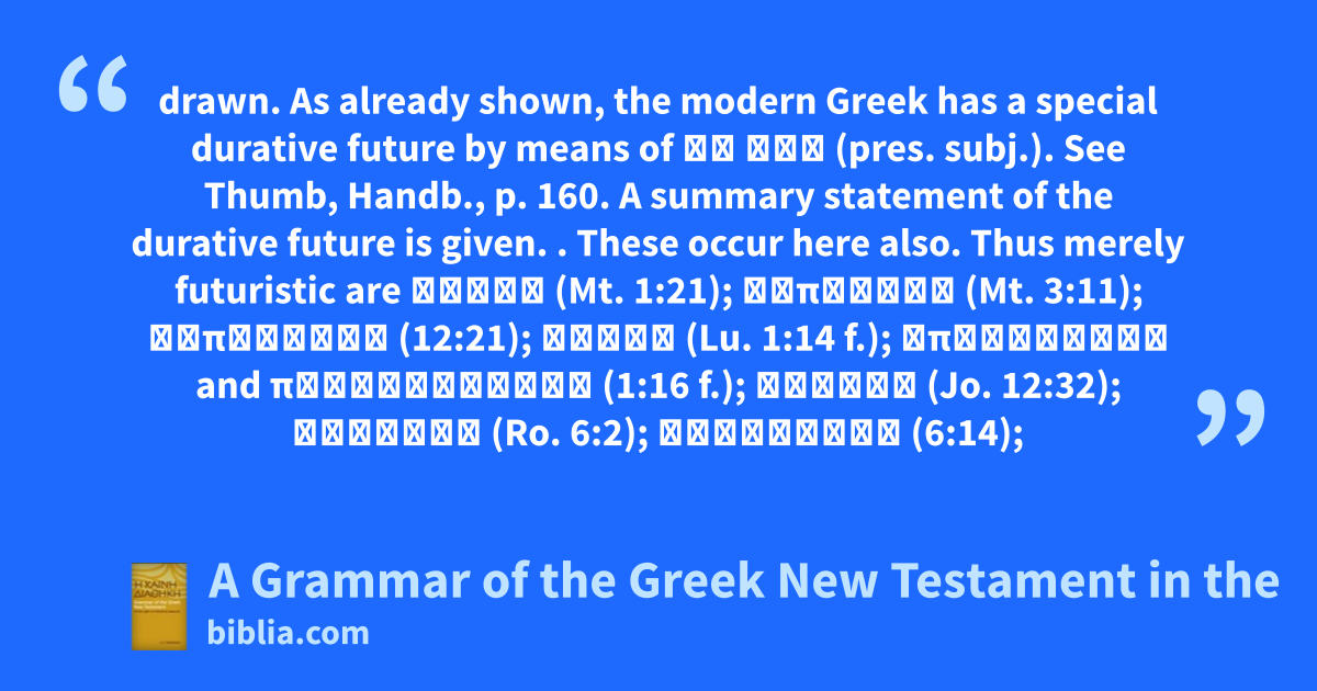 drawn. As already shown, the modern Greek has a special durative future by means of θὰ λύω (pres. subj.). See Thumb, Handb., p. 160. A summary statement of the durative future is given. . These occur here also. Thus merely futuristic are σώσει (Mt. 1:21); βαπτίσει (Mt. 3:11); ἐλπιοῦσιν (12:21); ἔσται (Lu. 1:14 f.); ἐπιστρέψει and προελεύσεται (1:16 f.); ἑλκύσω (Jo. 12:32); ζήσομεν (Ro. 6:2); κυριεύσει (6:14);