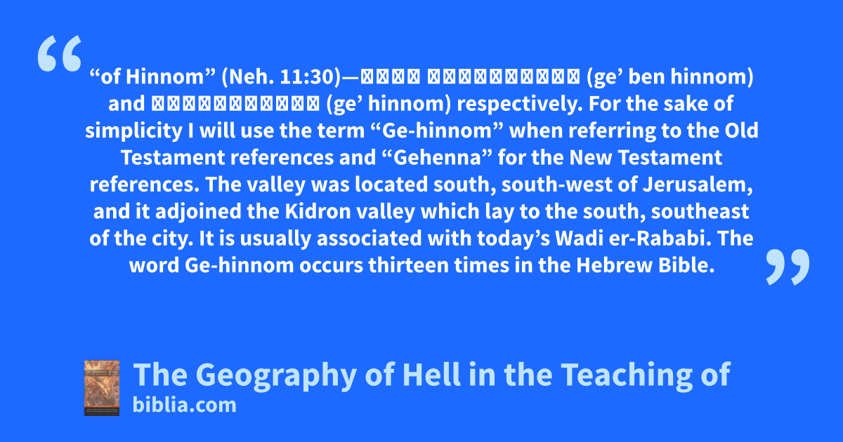 “of Hinnom” (Neh. 11:30)—גֵיא בֶן־הִנֹּם (ge’ ben hinnom) and גֵיא־הִנֹּם (ge’ hinnom) respectively. For the sake of simplicity I will use the term “Ge-hinnom” when referring to the Old Testament references and “Gehenna” for the New Testament references. The valley was located south, south-west of Jerusalem, and it adjoined the Kidron valley which lay to the south, southeast of the city. It is usually associated with today’s Wadi er-Rababi. The word Ge-hinnom occurs thirteen times in the Hebrew Bible.