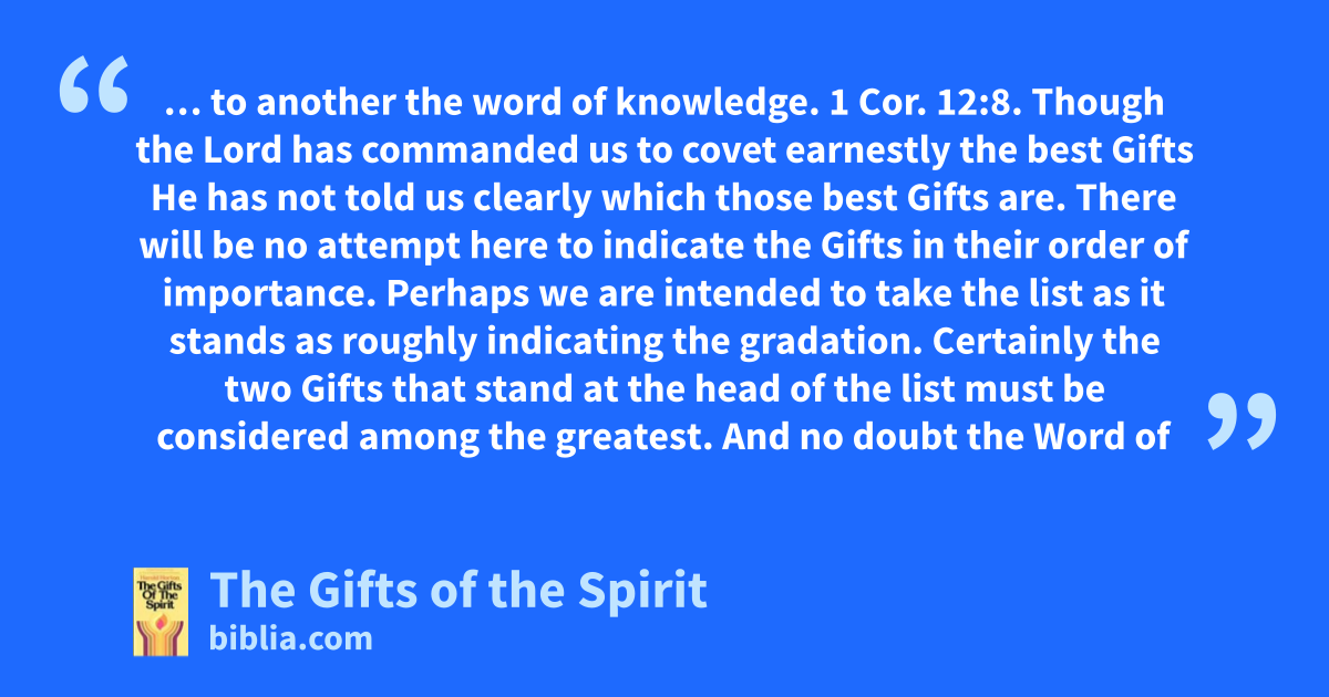 … to another the word of knowledge. 1 Cor. 12:8. Though the Lord has commanded us to covet earnestly the best Gifts He has not told us clearly which those best Gifts are. There will be no attempt here to indicate the Gifts in their order of importance. Perhaps we are intended to take the list as it stands as roughly indicating the gradation. Certainly the two Gifts that stand at the head of the list must be considered among the greatest. And no doubt the Word of