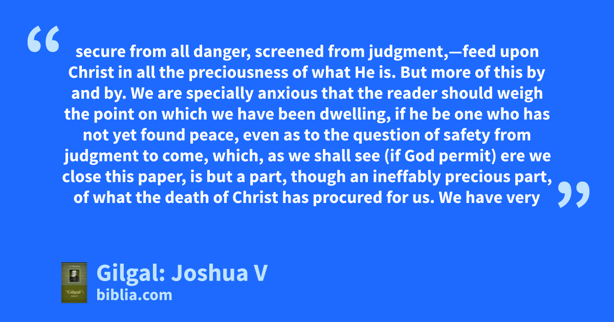 secure from all danger, screened from judgment,—feed upon Christ in all the preciousness of what He is. But more of this by and by. We are specially anxious that the reader should weigh the point on which we have been dwelling, if he be one who has not yet found peace, even as to the question of safety from judgment to come, which, as we shall see (if God permit) ere we close this paper, is but a part, though an ineffably precious part, of what the death of Christ has procured for us. We have very