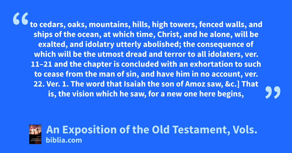 to cedars, oaks, mountains, hills, high towers, fenced walls, and ships of the ocean, at which time, Christ, and he alone, will be exalted, and idolatry utterly abolished; the consequence of which will be the utmost dread and terror to all idolaters, ver. 11–21 and the chapter is concluded with an exhortation to such to cease from the man of sin, and have him in no account, ver. 22. Ver. 1. The word that Isaiah the son of Amoz saw, &c.] That is, the vision which he saw, for a new one here begins,