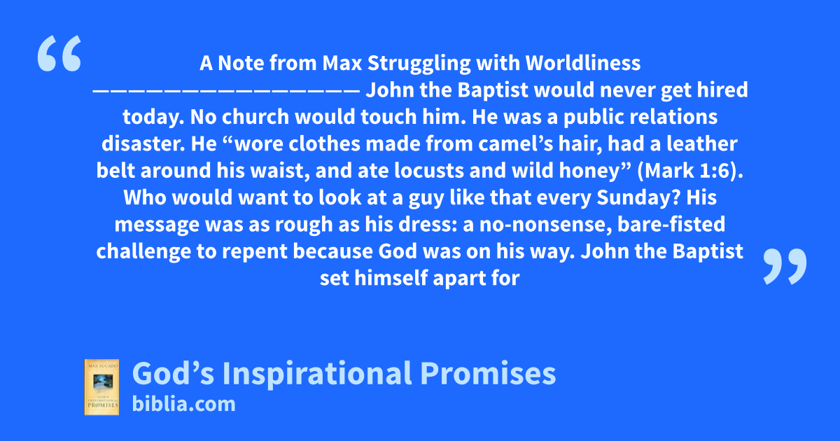 A Note from Max Struggling with Worldliness ——————————————— John the Baptist would never get hired today. No church would touch him. He was a public relations disaster. He “wore clothes made from camel’s hair, had a leather belt around his waist, and ate locusts and wild honey” (Mark 1:6). Who would want to look at a guy like that every Sunday? His message was as rough as his dress: a no-nonsense, bare-fisted challenge to repent because God was on his way. John the Baptist set himself apart for