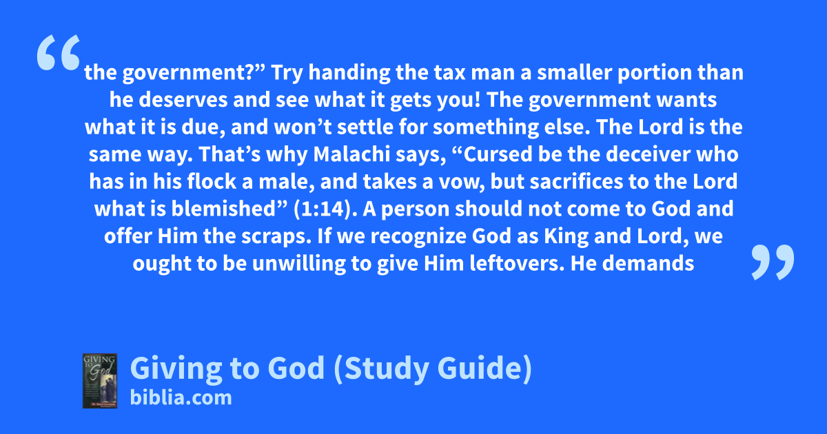 the government?” Try handing the tax man a smaller portion than he deserves and see what it gets you! The government wants what it is due, and won’t settle for something else. The Lord is the same way. That’s why Malachi says, “Cursed be the deceiver who has in his flock a male, and takes a vow, but sacrifices to the Lord what is blemished” (1:14). A person should not come to God and offer Him the scraps. If we recognize God as King and Lord, we ought to be unwilling to give Him leftovers. He demands