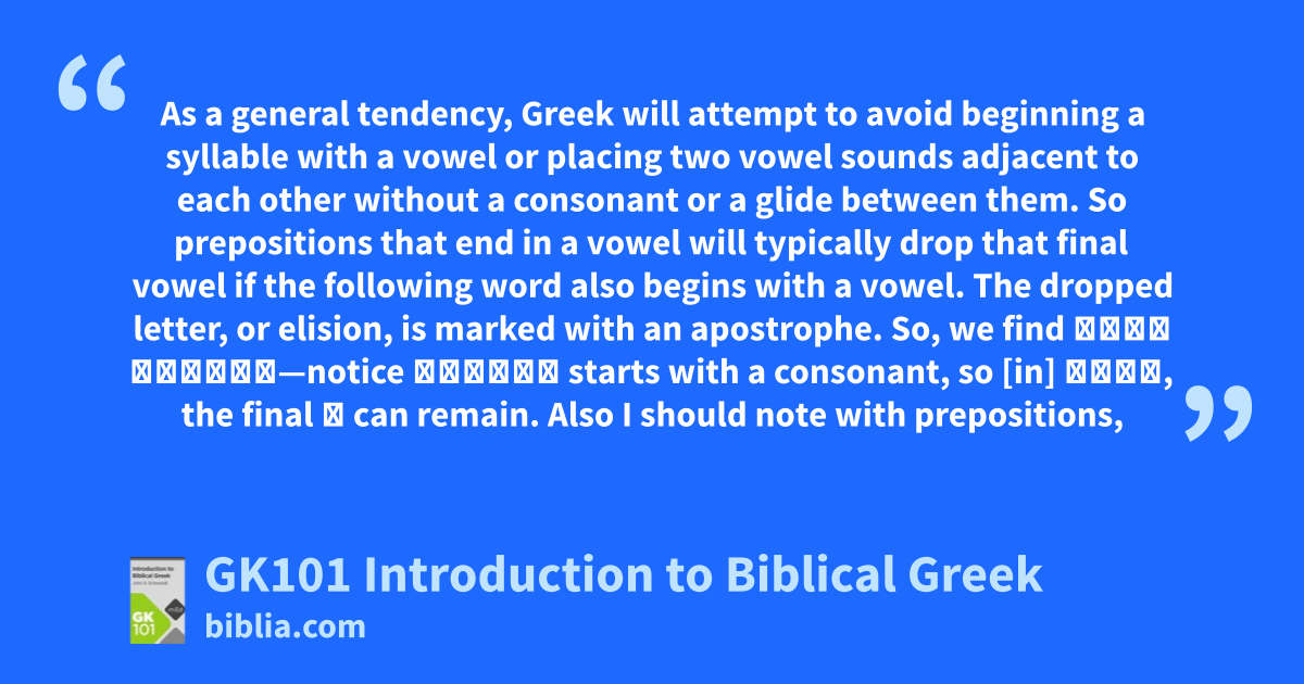 As a general tendency, Greek will attempt to avoid beginning a syllable with a vowel or placing two vowel sounds adjacent to each other without a consonant or a glide between them. So prepositions that end in a vowel will typically drop that final vowel if the following word also begins with a vowel. The dropped letter, or elision, is marked with an apostrophe. So, we find κατὰ γραφάς—notice γραφάς starts with a consonant, so [in] κατὰ, the final α can remain. Also I should note with prepositions,