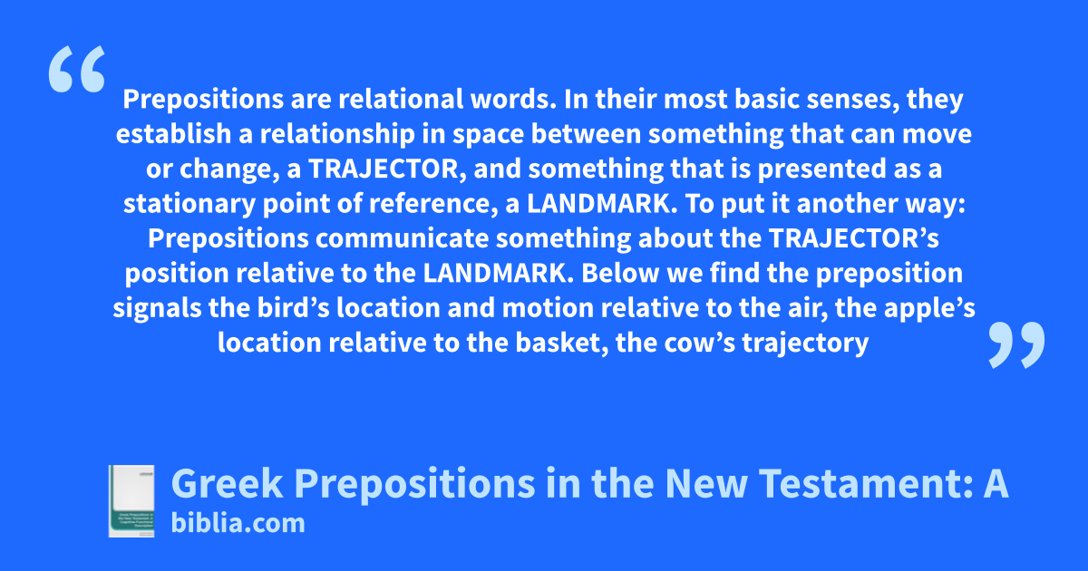 Prepositions are relational words. In their most basic senses, they establish a relationship in space between something that can move or change, a TRAJECTOR, and something that is presented as a stationary point of reference, a LANDMARK. To put it another way: Prepositions communicate something about the TRAJECTOR’s position relative to the LANDMARK. Below we find the preposition signals the bird’s location and motion relative to the air, the apple’s location relative to the basket, the cow’s trajectory