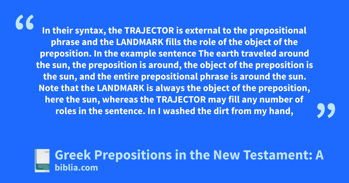 In their syntax, the TRAJECTOR is external to the prepositional phrase and the LANDMARK fills the role of the object of the preposition. In the example sentence The earth traveled around the sun, the preposition is around, the object of the preposition is the sun, and the entire prepositional phrase is around the sun. Note that the LANDMARK is always the object of the preposition, here the sun, whereas the TRAJECTOR may fill any number of roles in the sentence. In I washed the dirt from my hand,