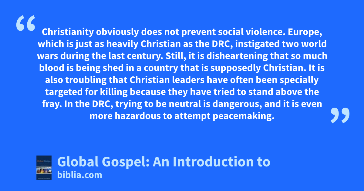Christianity obviously does not prevent social violence. Europe, which is just as heavily Christian as the DRC, instigated two world wars during the last century. Still, it is disheartening that so much blood is being shed in a country that is supposedly Christian. It is also troubling that Christian leaders have often been specially targeted for killing because they have tried to stand above the fray. In the DRC, trying to be neutral is dangerous, and it is even more hazardous to attempt peacemaking.