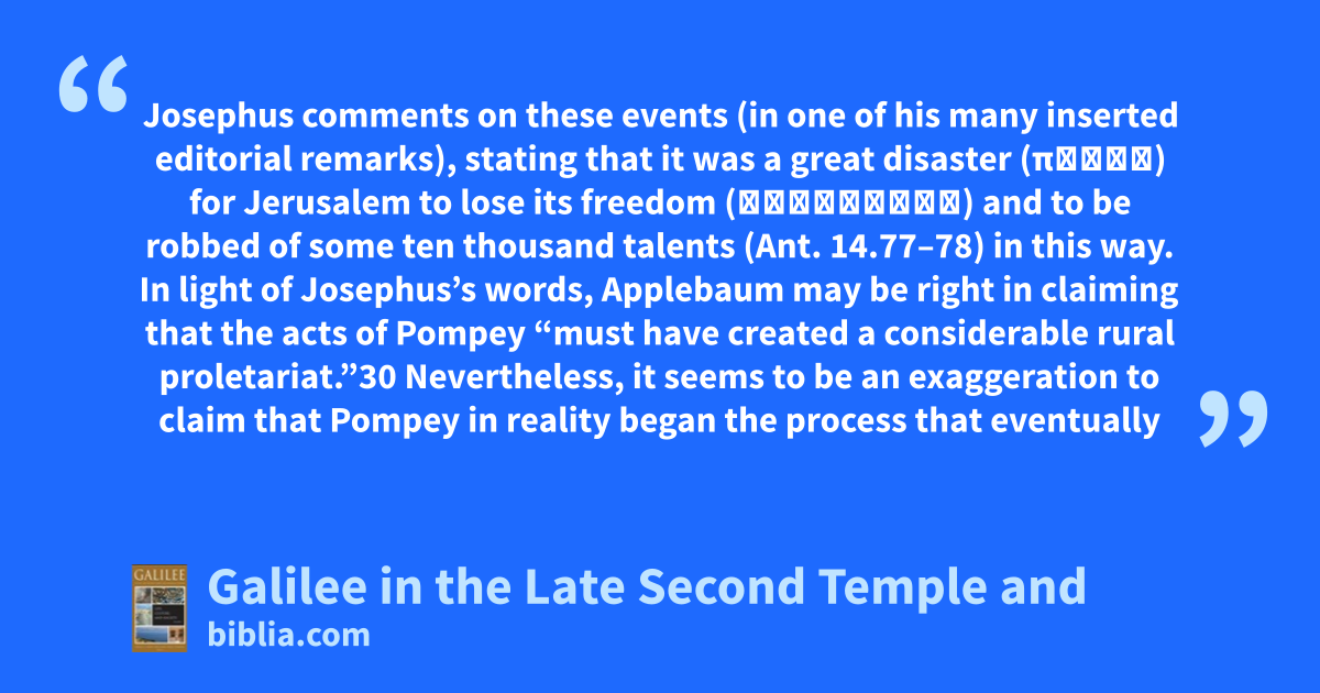 Josephus comments on these events (in one of his many inserted editorial remarks), stating that it was a great disaster (πάθος) for Jerusalem to lose its freedom (ἐλευθερία) and to be robbed of some ten thousand talents (Ant. 14.77–78) in this way. In light of Josephus’s words, Applebaum may be right in claiming that the acts of Pompey “must have created a considerable rural proletariat.”30 Nevertheless, it seems to be an exaggeration to claim that Pompey in reality began the process that eventually