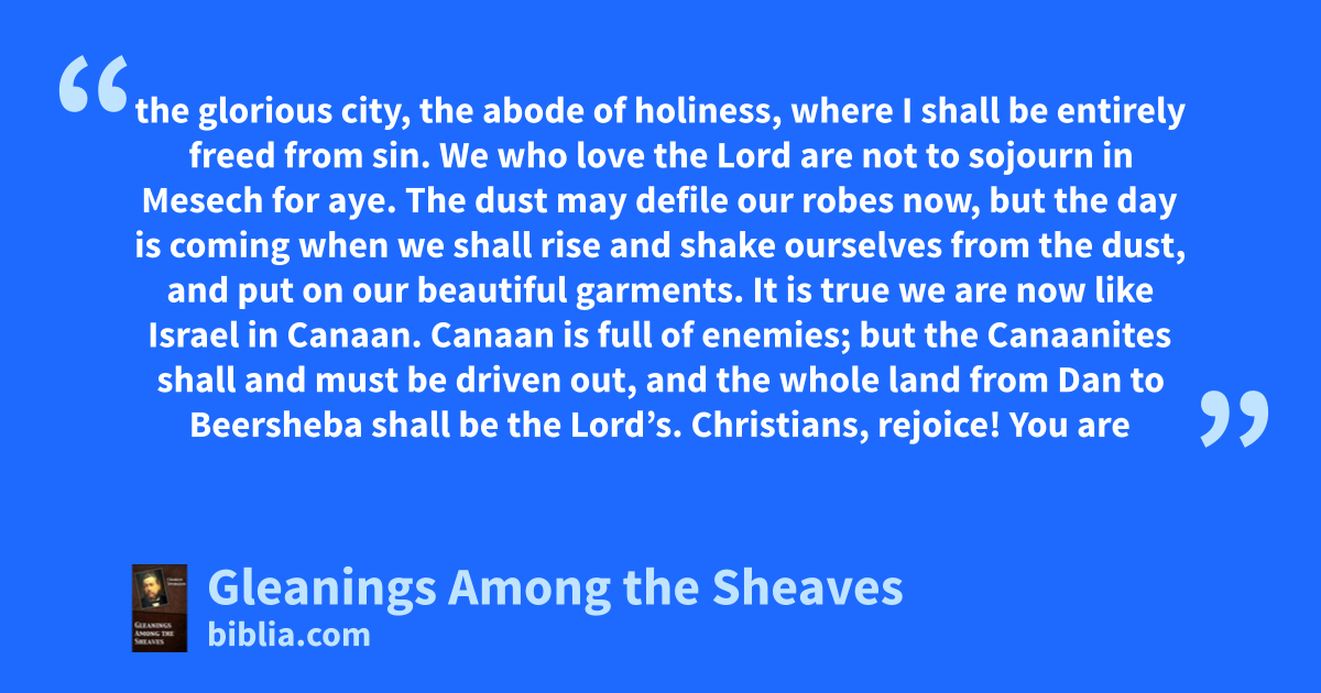 the glorious city, the abode of holiness, where I shall be entirely freed from sin. We who love the Lord are not to sojourn in Mesech for aye. The dust may defile our robes now, but the day is coming when we shall rise and shake ourselves from the dust, and put on our beautiful garments. It is true we are now like Israel in Canaan. Canaan is full of enemies; but the Canaanites shall and must be driven out, and the whole land from Dan to Beersheba shall be the Lord’s. Christians, rejoice! You are