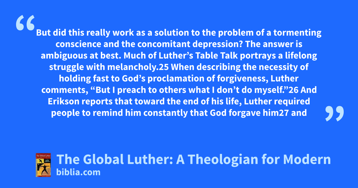 But did this really work as a solution to the problem of a tormenting conscience and the concomitant depression? The answer is ambiguous at best. Much of Luther’s Table Talk portrays a lifelong struggle with melancholy.25 When describing the necessity of holding fast to God’s proclamation of forgiveness, Luther comments, “But I preach to others what I don’t do myself.”26 And Erikson reports that toward the end of his life, Luther required people to remind him constantly that God forgave him27 and