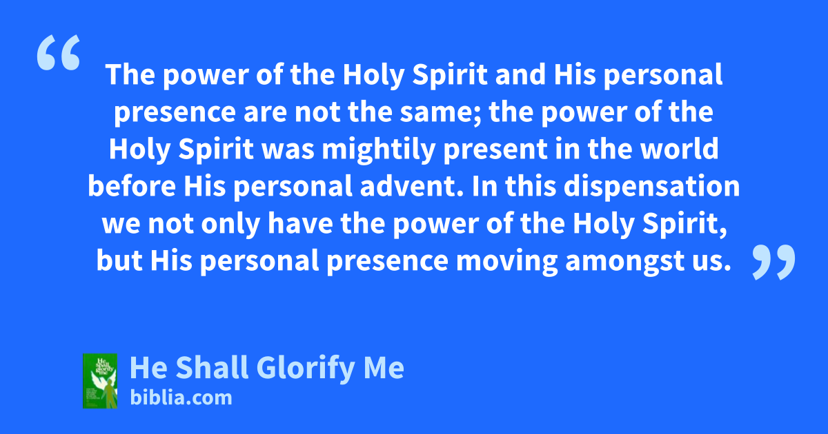 The power of the Holy Spirit and His personal presence are not the same; the power of the Holy Spirit was mightily present in the world before His personal advent. In this dispensation we not only have the power of the Holy Spirit, but His personal presence moving amongst us.