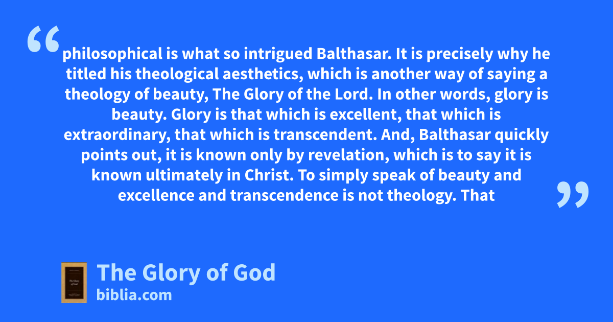philosophical is what so intrigued Balthasar. It is precisely why he titled his theological aesthetics, which is another way of saying a theology of beauty, The Glory of the Lord. In other words, glory is beauty. Glory is that which is excellent, that which is extraordinary, that which is transcendent. And, Balthasar quickly points out, it is known only by revelation, which is to say it is known ultimately in Christ. To simply speak of beauty and excellence and transcendence is not theology. That